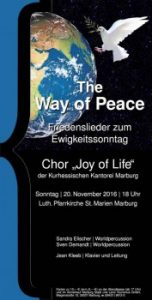 Der Chor Joy of Life präsentiert Friedenslieder aus Afrika, Asien, Karibik, Russland und Europa. Dabei geht es um Brennpunkte unserer Erde, in denen Kriege, Missachtung der Menschenrechte, Unterdrückung von Völkern oder wirtschaftliche Ausbeutung herrschen.