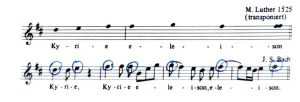 Bachs „Kyrie“ ist mit Abstand sein längster Eingangssatz überhaupt. Er gehört auch zu den wenigen Eingangssätzen, die gleich mit dem Chorgesang beginnen. Ein dreifacher Kyrieruf bezieht sich auf ein gregorianisches Kyrie, welches in Luthers Messe von 1526 übernommen wurde. Wie ein Choral wird diese Melodie vom Sopran übernommen.